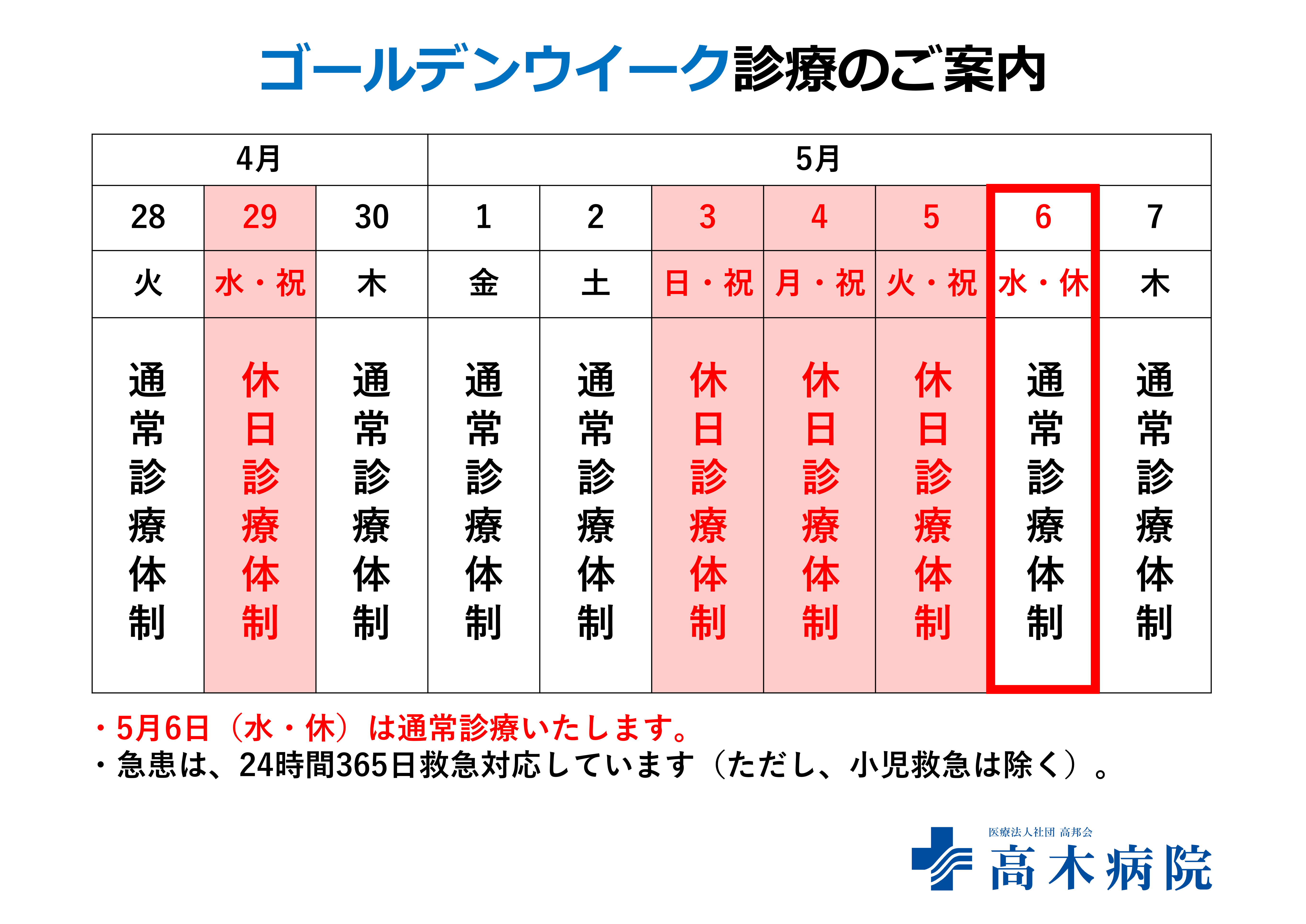 高木病院のゴールデンウイーク時期の診療は下記の通りとなっております。 5月6日(水・休)は通常診療いたします。